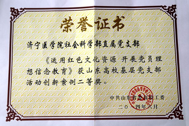 近日,山东省委高校工委下发《关于表彰全省高校基层党支部活动创新案例的决定》(鲁高工委〔2014〕14号),对全省高校基层党支部特色鲜明、务实管用、成效显著的活动创新案例进行表彰,我校社科部直属党支部报送的《运用红色文化资源 开展党员理想信念教育》荣获山东省高校基层党支部活动创新案例二等奖。