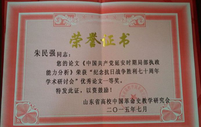 社科部朱民强博士荣获山东省高校“纪念抗日战争胜利70周年学术研讨会”优秀论文一等奖
