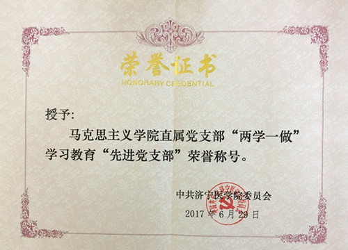 近日,学校党委下发《关于表彰“两学一做”学习教育先进党支部和优秀共产党员的决定》(济医党字[2017]29号)文件。马克思主义学院直属党支部荣获“两学一做”学习教育“先进党支部”荣誉称号。同时,马克思主义学院教师葛洪刚同志获“两学一做”学习教育“优秀共产党员”荣誉称号。