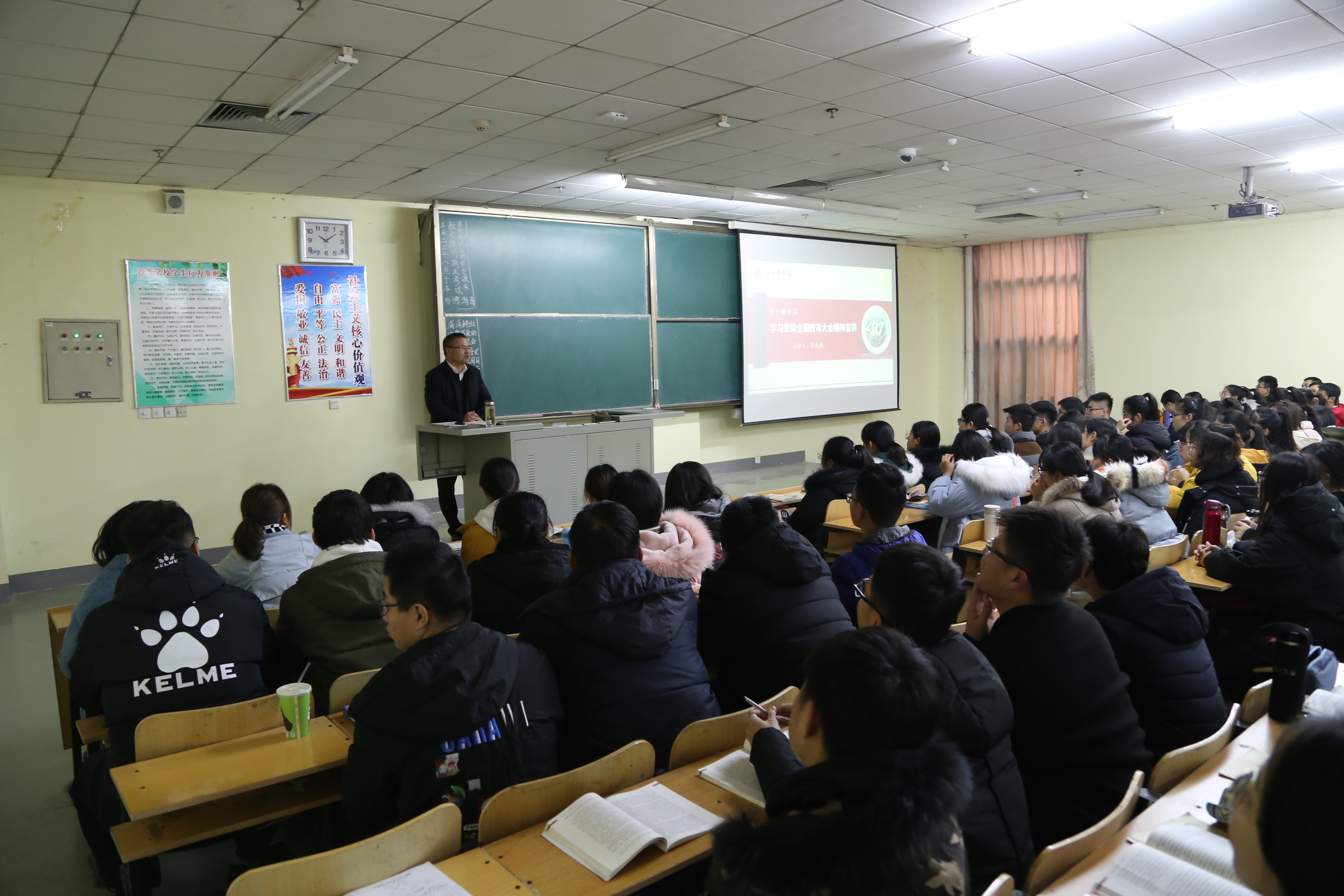 12月11日上午,党委副书记、院长张成博深入思政课课堂,以《学习贯彻全国教育大会精神宣讲》为题,在111教室为2018级护理学专业的同学作了一场生动的报告。报告由马克思主义学院院长秦建中主持。