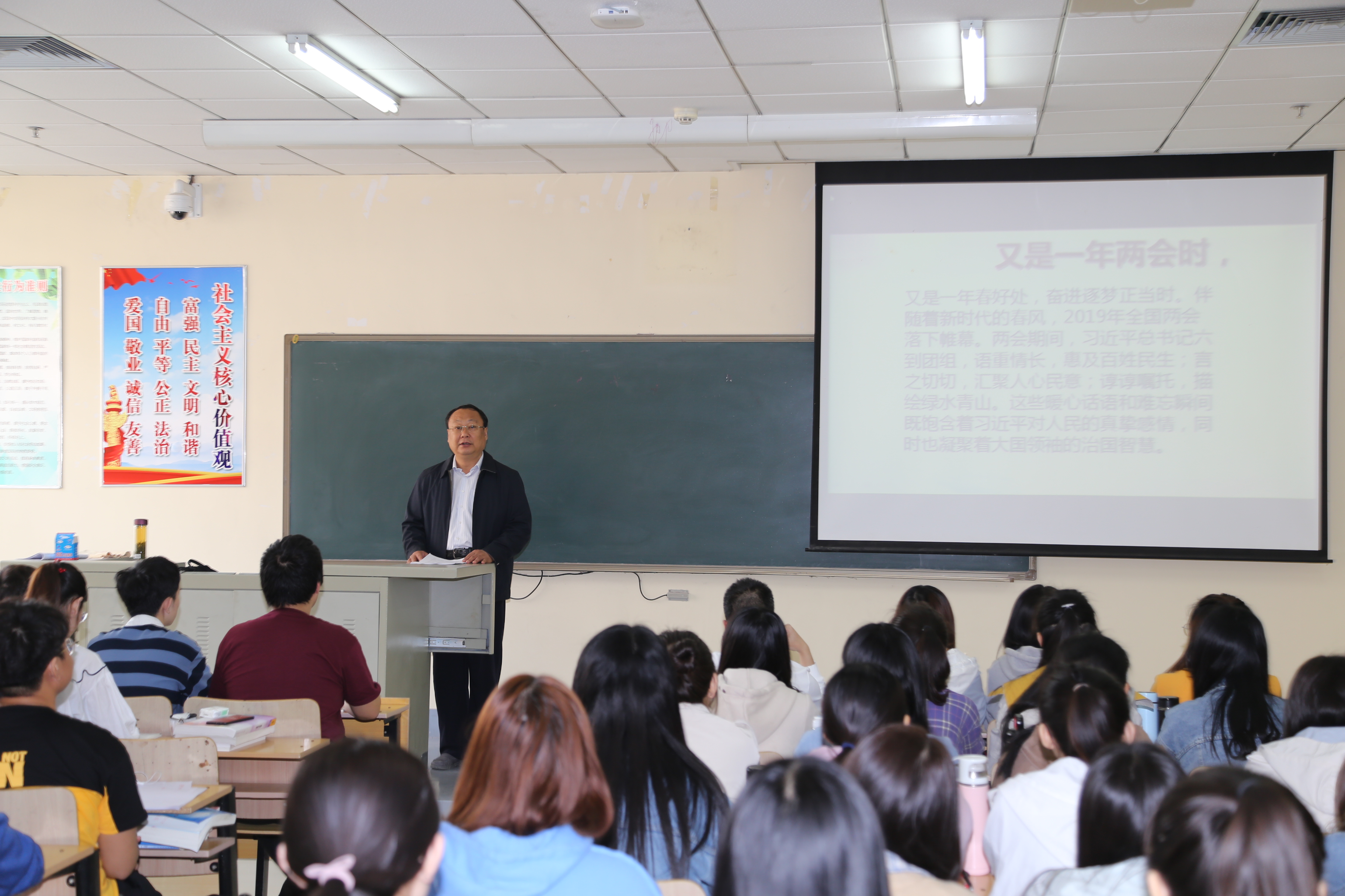 为认真贯彻落实全国教育大会、全国高校思想政治工作会议和习近平总书记在学校思想政治理论课教师座谈会上的重要讲话精神,落实高校领导班子成员尤其是党委书记、校长,要主动进课堂、进班级,每学期至少给学生讲一堂思想政治课,推动高校领导干部落实立德树人根本任务的精神要求,3月16号上午,党委书记马安宁来到《形势与政策教育》课堂,为2017级护理专业本科生讲授“2019全国两会精神学习解读”专题。