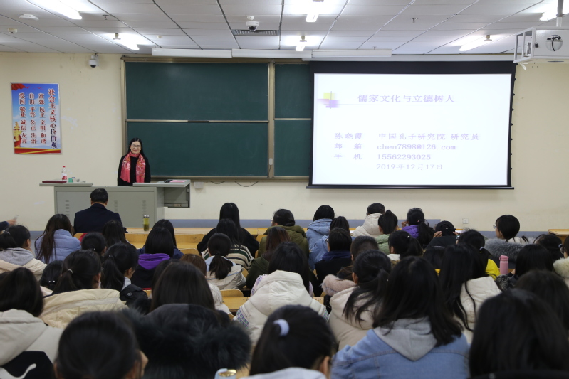 陈晓霞以《儒家文化与立德树人》为题,为同学们阐述了孔子生平,孔子创立儒家文化的历史渊源和地域优势,儒家文化的内涵和特征,孔子的思想及其对中国哲学、教育学、政治学、历史学、文献学、治国理政等方面的历史贡献,结合青年学生的特点,分析了儒家文化对立德树人的现实意义和大学生践行优秀传统文化的路径。特别就社会上对儒家文化的一些错误认识或误解,进行了批驳和澄清。课堂上,同学们认真听讲,仔细作笔记,课堂秩序井然。