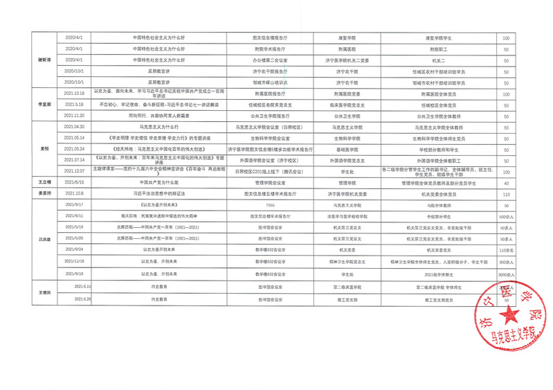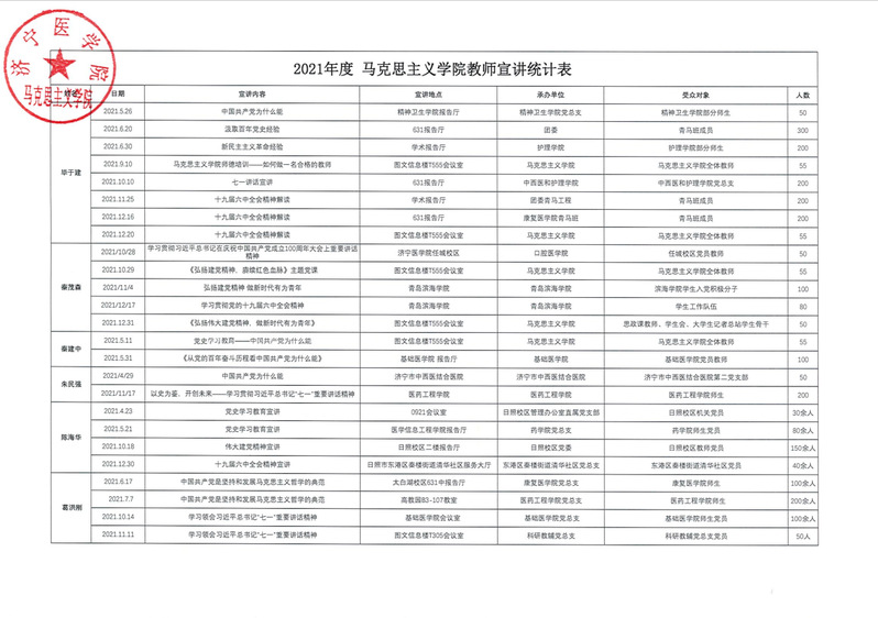 自党史学习教育开展以来,马克思主义学院13位党史学习教育宣讲团成员共为全校师生开展党史宣讲、习近平“七一”重要讲话精神、伟大建党精神、十九届六中全会精神等宣讲活动几十场次,并深入到社区、医院宣讲,发挥了社会服务功能。马克思主义学院以实际行动发挥了党史学习教育排头兵作用,为我校深入开展党史学习教育等做出突出贡献。在此,马克思主义学院对参与宣讲的专家老师们给予表扬和感谢!