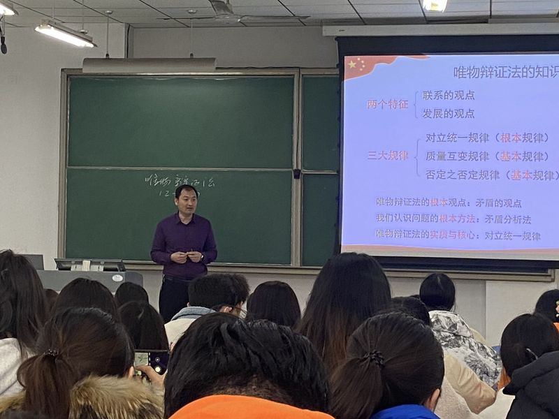 陈海华首先总结回顾了辩证唯物论的主要内容,并结合辩证唯物论和唯物辩证法的关系,引出唯物辩证法的知识框架,使听课学生在课堂导入阶段对唯物辩证法有了一个整体把握。随后,他从联系和发展的概念入手,详细阐述了联系和发展的普遍性。授课中,他用青年大学生熟悉的生活事例和当前国内外时政热点作为切入口,抓热点、戳痛点、讲重点,引发了学生的积极互动和深入思考。