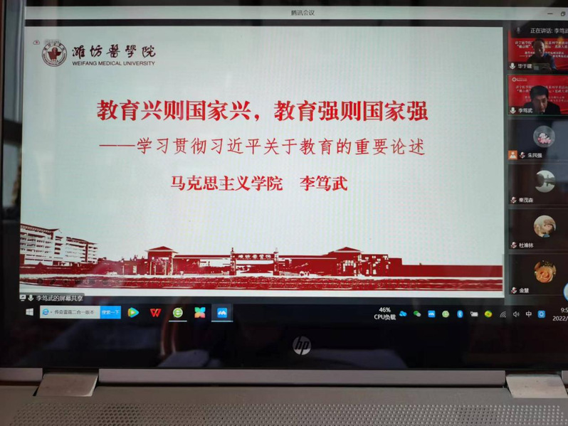 马克思主义学院副院长秦茂森与全体教师及临床医学专业、护理学专业等学生260人参加了讲座。讲座以腾讯会议形式进行。培训内容将通过《形势与政策》课程教学平台,使更多学生进行线上学习。