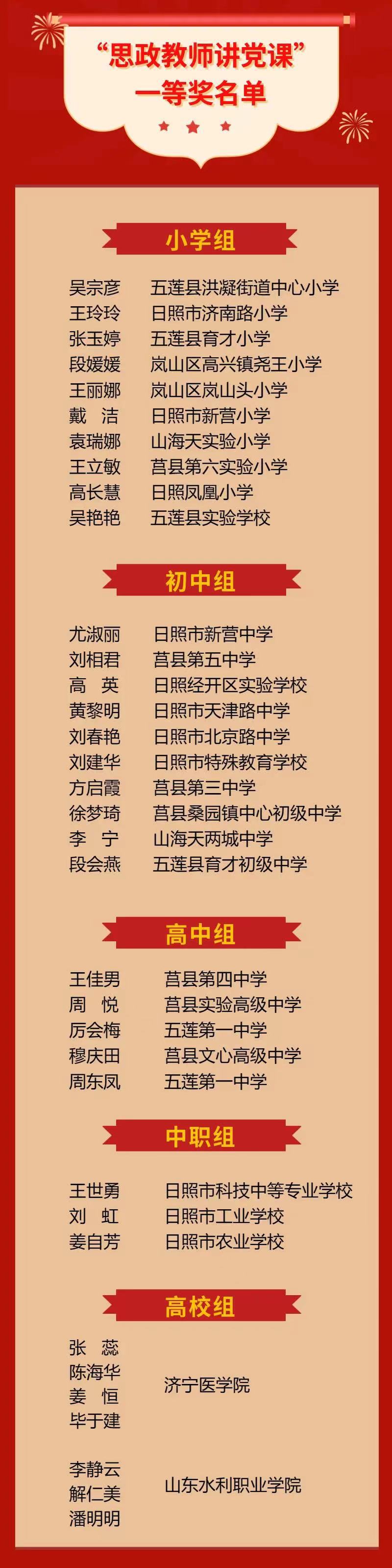 7月1日,我院张蕊、陈海华、姜恒、毕于建老师在日照市教育局举办的全市大中小学“思政教师讲党课”比赛活动中荣获高校组一等奖。